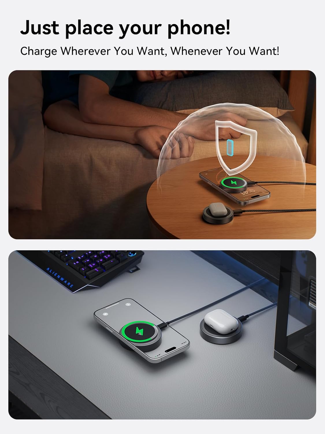 🔒【Intelligent Protection|Safe & Reliable Charging】This qi2 MagSafe charger for iphone 17 pro max features high thermal conductivity graphene material and is equipped with a multi-layer heat dissipation structure, effectively supporting heat dissipation. The wireless charging pad also comes with multiple protection features including overheating protection, foreign object detection and intelligent temperature control. When the battery reaches 80%, it automatically switches to a charging mode with a trickle current to prevent overconsumption of the device’s battery. This protects the battery while ensuring safe charging, allowing you to sleep peacefully every night.