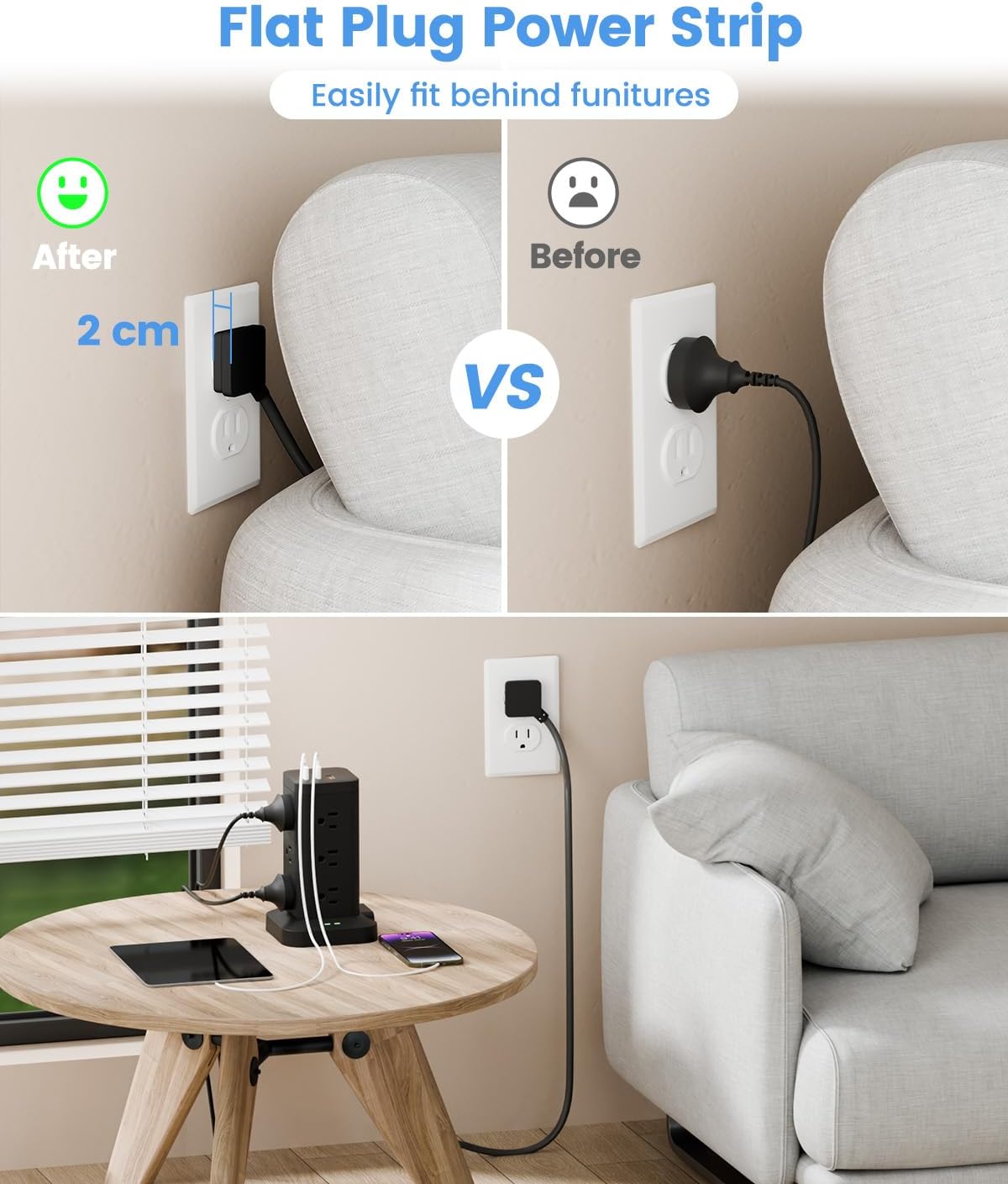 High-Quality Power Strip(UL standard) : The power strip tower is fireproof, high-temperature resistant. The premium-grade material employed significantly increases the lifespan of the sockets, ensuring the safety of your gadgets and short circuit protection.